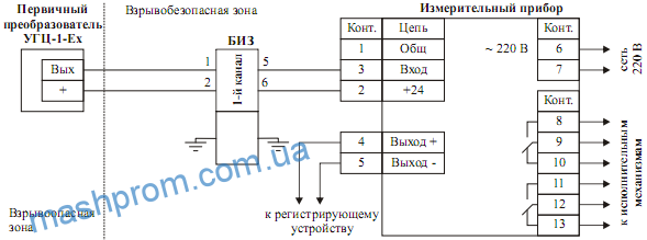 Рис. 8. Схема внешних электрических соединений УГЦ-1-Ех для размещения ПП во взрывоопасной зоне |