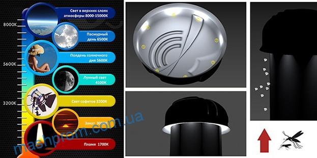 5. Светодиодная подсветка, имитирующая лунный свет, — создает так называемый туннельный эффект. Ученые установили, что лунный свет насекомые используют для навигации. Светодиоды подсветки имеют специально подобранную световую температуру и создают направленный «световой конус», в который насекомые пытаются вылететь. Они принимают его за лунный свет и попадают прямо в приемник прибора.
